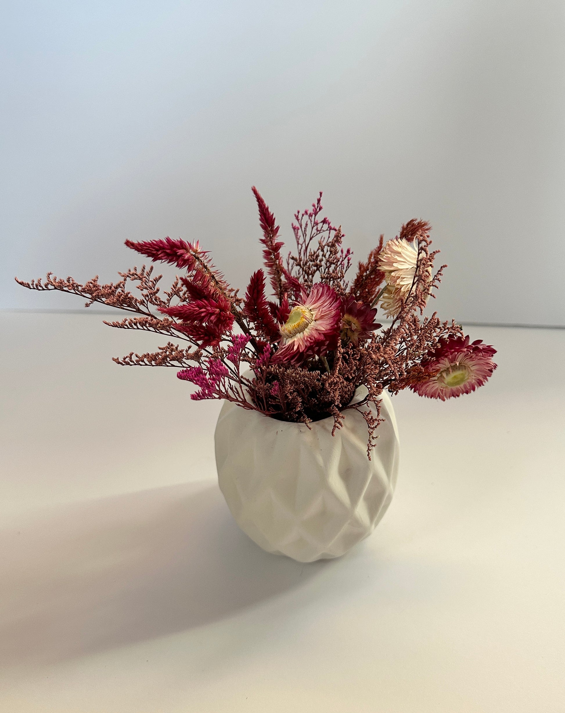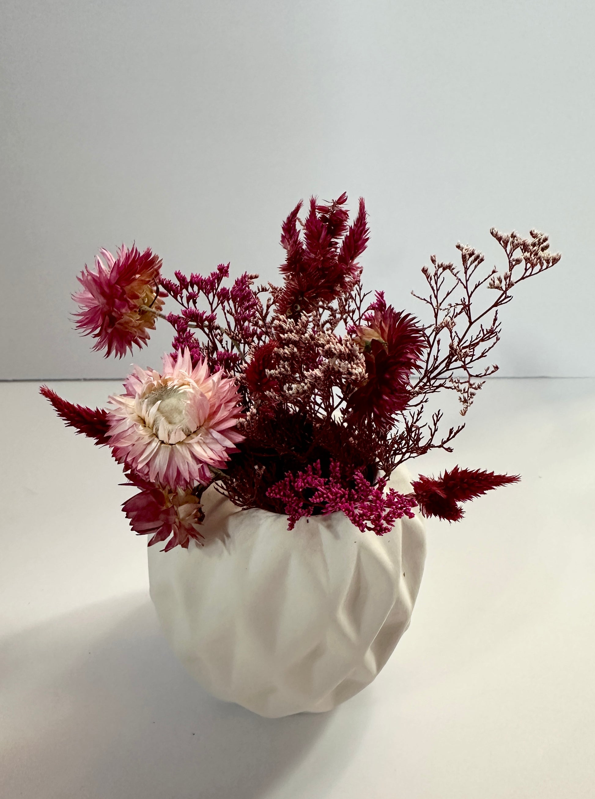 Sprinkle your crush with a mini lover set. Each vase includes a variety of straw flower, caspia and celosia.