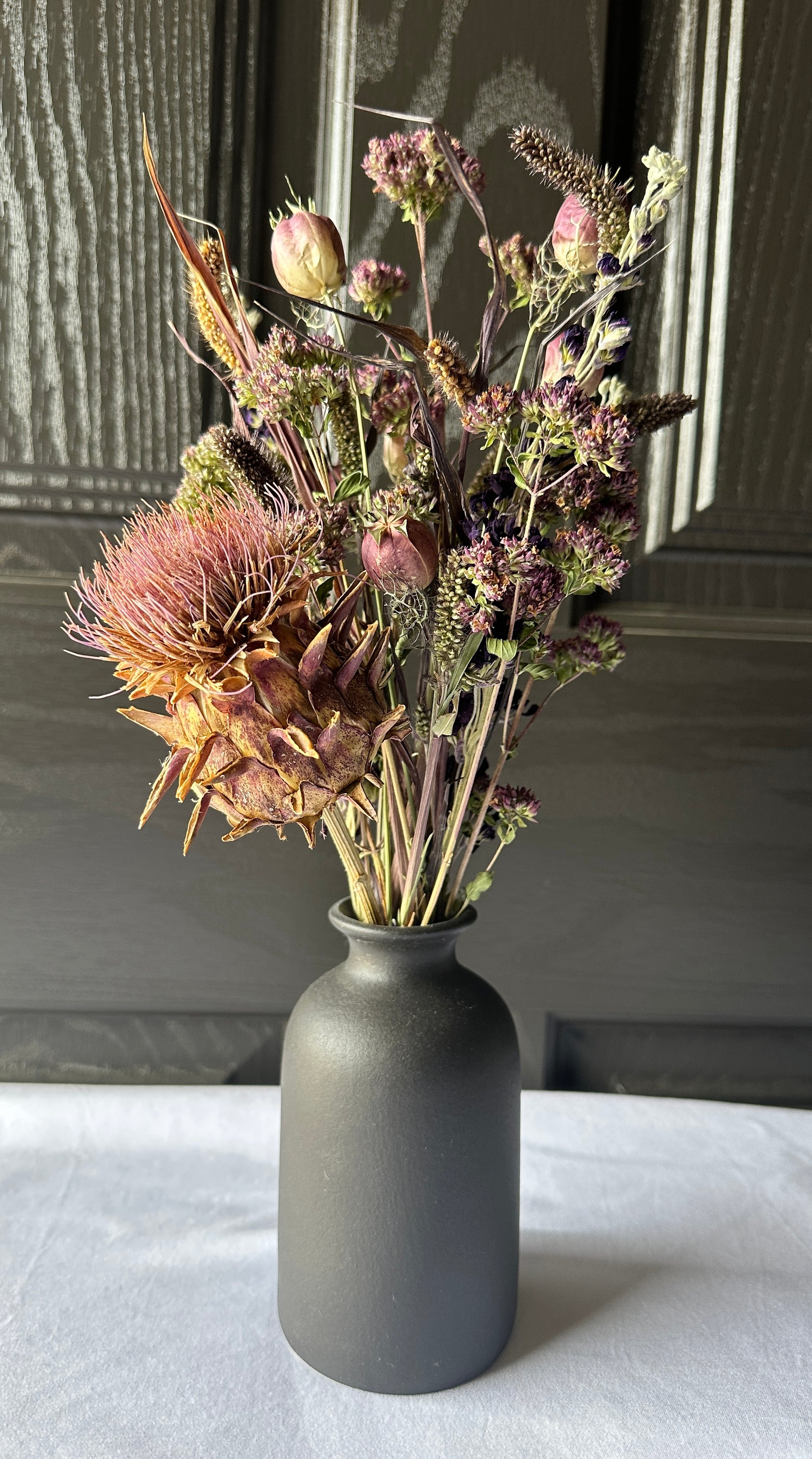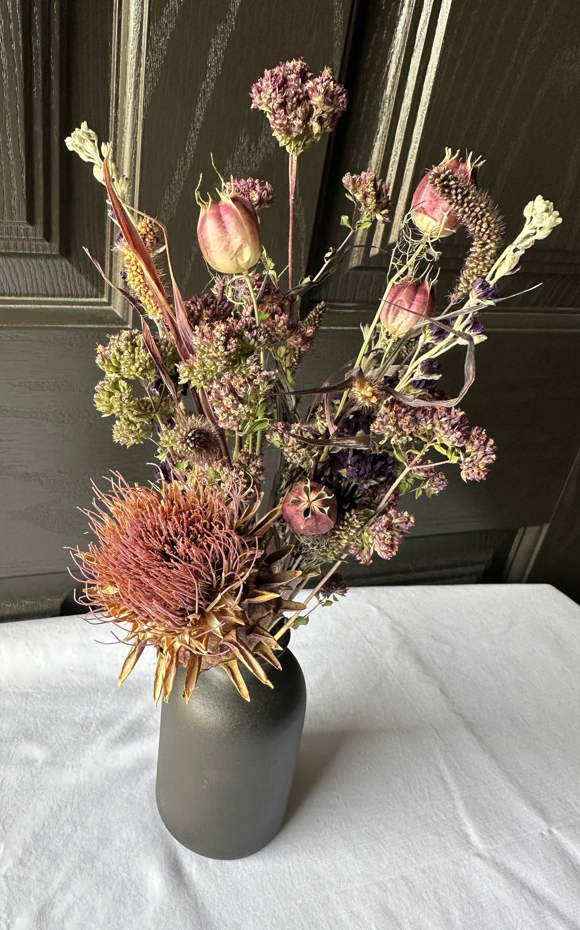 Dried Nigella, mini red jewel grass, cardoon, penny royal, purple larkspur