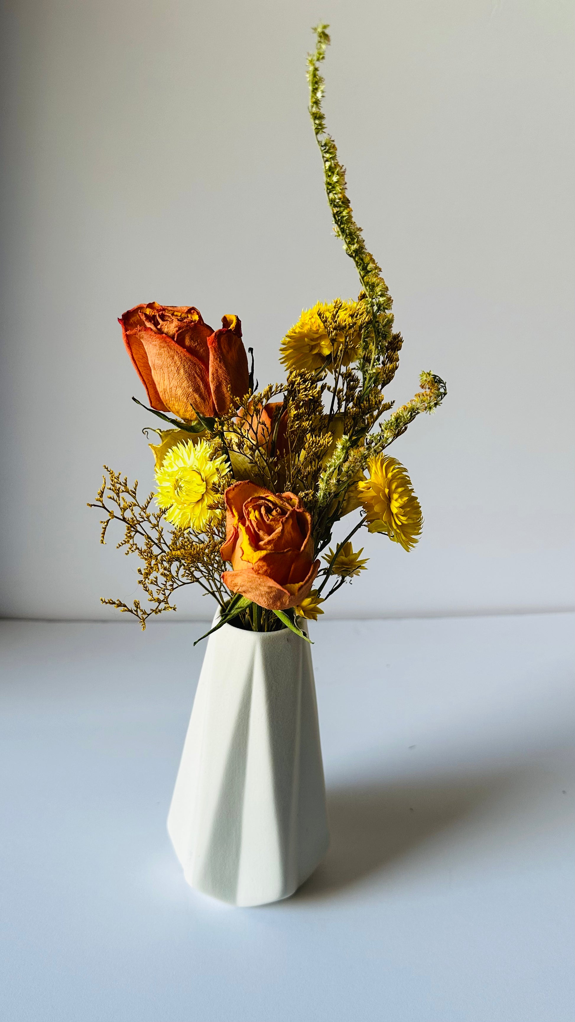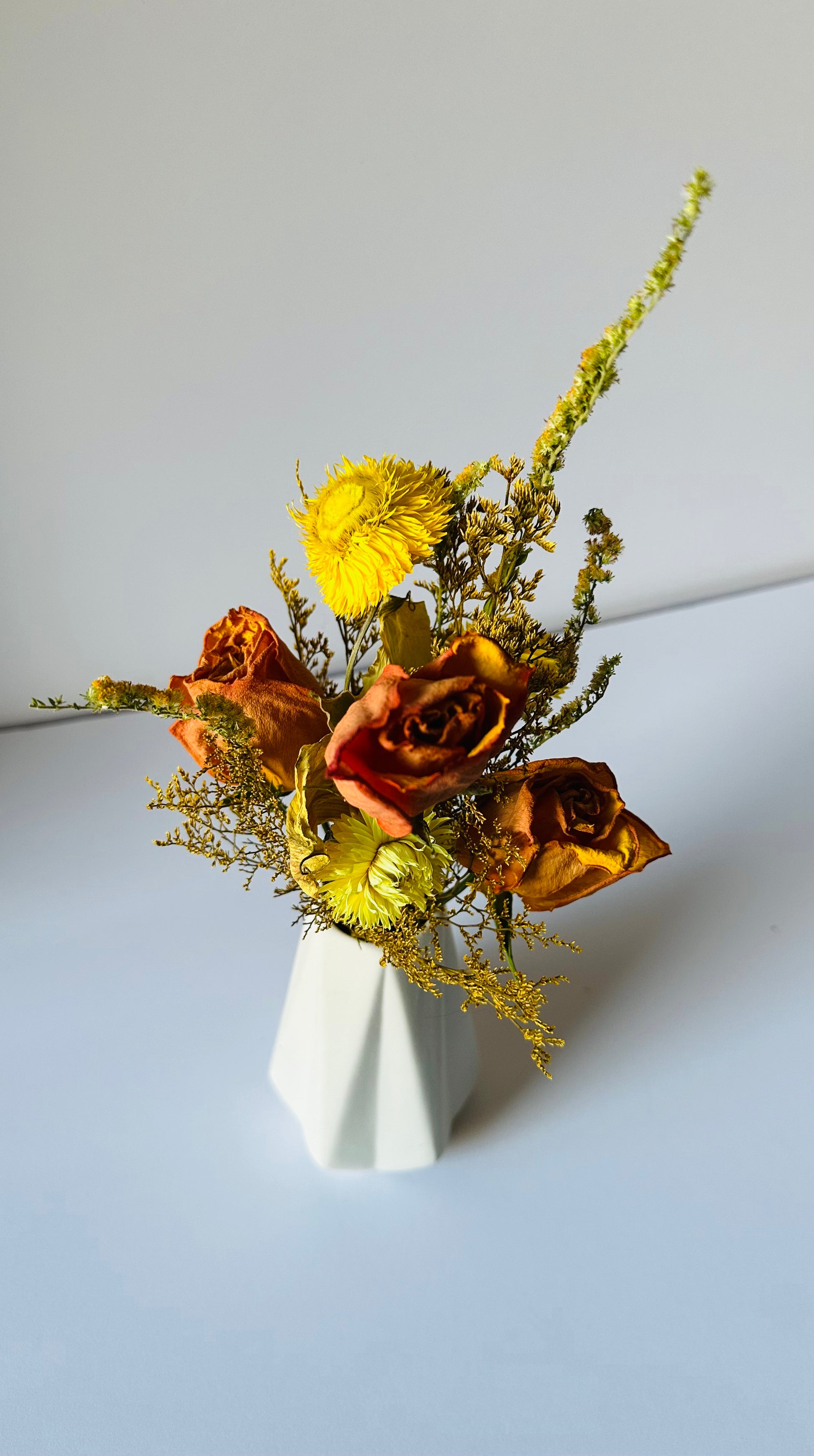 Have a little bit of sunshine everyday with our sunny bud vase. Each vase includes a variety of dried strawflowers, orange roses, caspia and solidago.