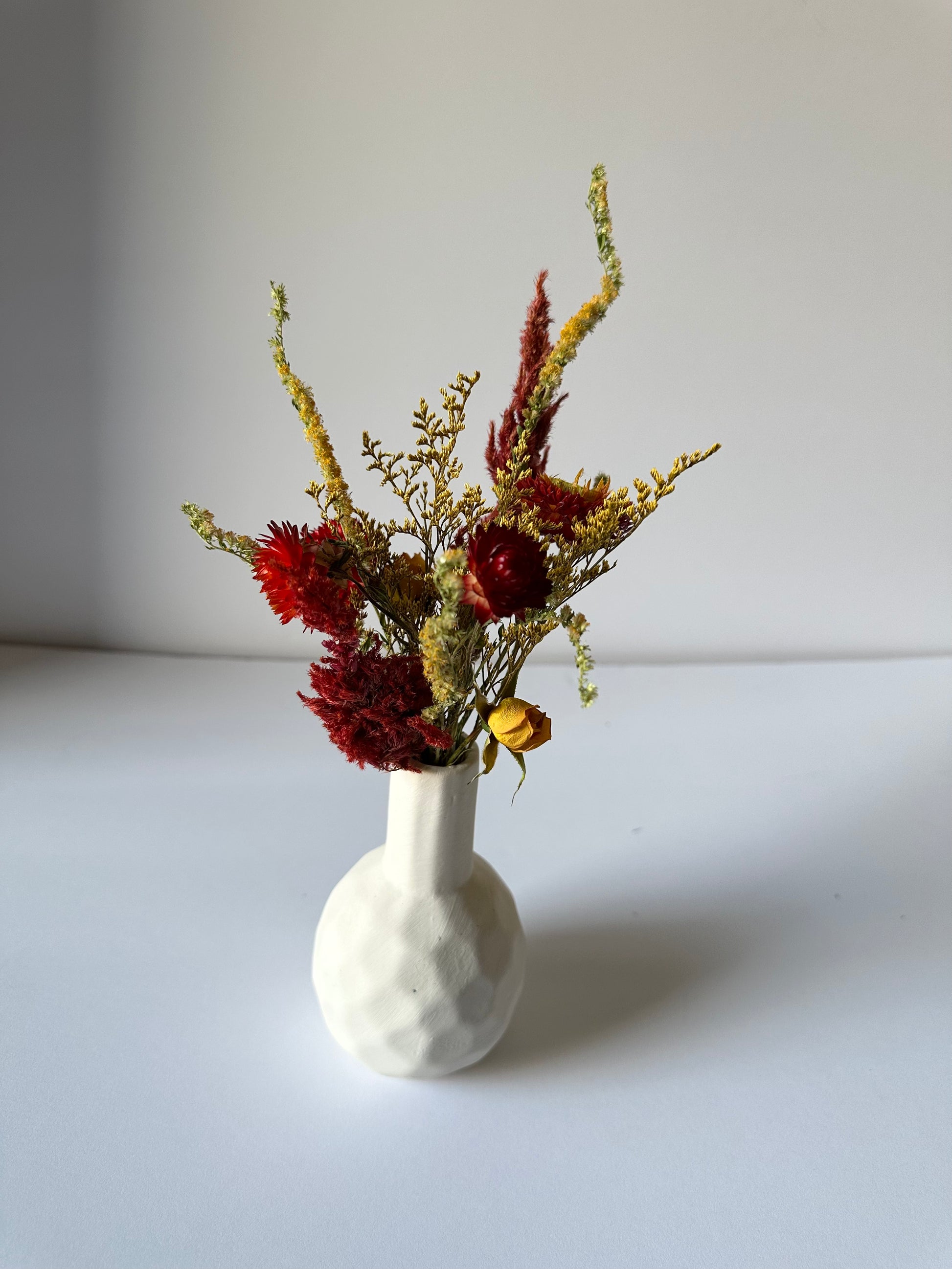 Dried Solidago, yellow caspia, red/maroon strawflower, celosia plume